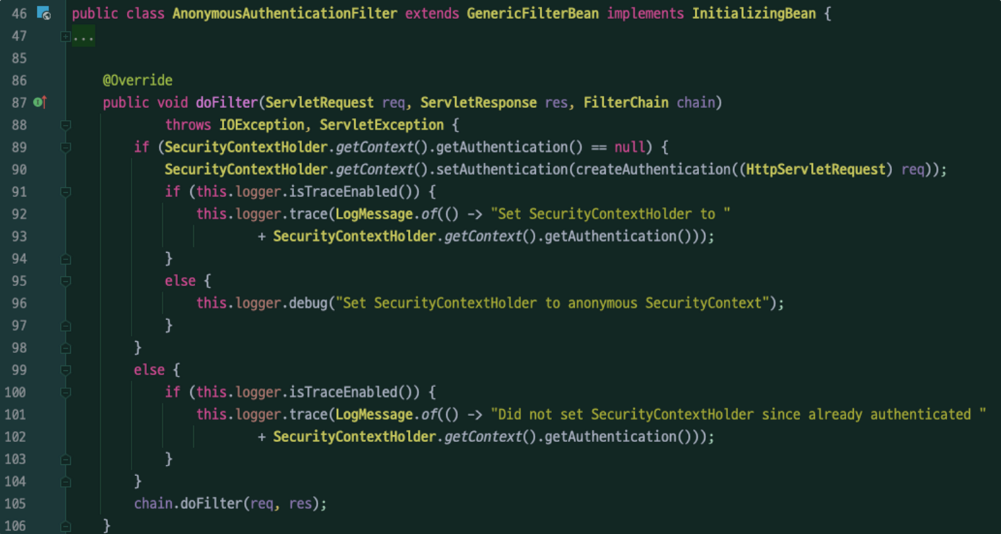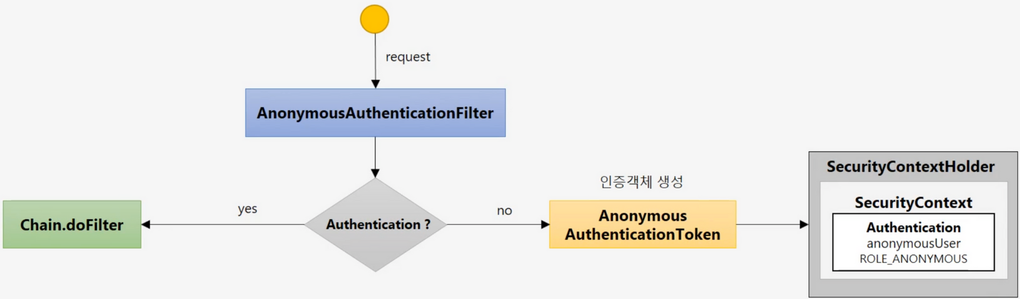 따라서 익명 사용자를 허용하는 인증 체계일 경우 AnonymousAuthenticationFilter 를 사용해야 한다